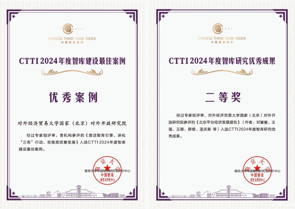 连续三年创佳绩!国家(北京)对外开放研究院荣获2024年度CTTI智库评价两项大奖